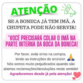 Especificações Técnicas: - Chupeta personalizada para boneca reborn - Bico com imã embutido - Acompanha 1 imã solto - Tamanho do imã solto: 12,5mm x 2mm - Recomendamos utilizar cola de silicone para fixar o imã na boneca cola não inclusa