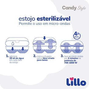 Inclui um estojo para higienização e transporte. Para esterilizar a chupeta, adicione a água (quantidade descrita no estojo), coloque a chupeta dentro e leve ao micro-ondas por 4 minutos.
