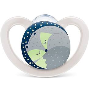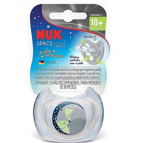 A Chupeta Space Glow da Nuk, possui furos de ventilação de ar e permite que a pele sensível do bebê respire e ainda brilha no escuro.