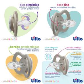 A Chupetas Little Friends Lillo possui bico em silicone macio e flexível, foi desenvolvido em formato simétrico que possibilita o uso em qualquer posição, sua base fina permite que o bico fique mais próximo aos lábios da criança, proporcionando maior conforto e fácil adaptação.