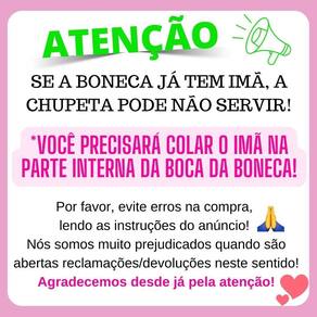 1. A chupeta já vem com o imã colado? Sim, a chupeta já vem pronta para uso, com o imã totalmente embutido e protegido para não danificar a boquinha da boneca.