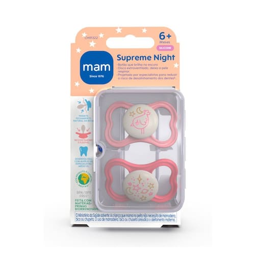 As nossas Chuchas Night obtêm o seu efeito brilhante a partir de um pigmento luminoso adicionado ao material do botão da chucha, e não dos pigmentos corantes habituais. A sua estrutura cristalina especial é naturalmente carregada durante o dia ao absorver a luz diurna. No escuro, emite a luz absorvida durante horas. Tal como acontece com todos os materiais que utilizamos, este material especial é totalmente inócuo e seguro, e foi cuidadosamente testado pela MAM.