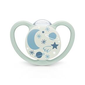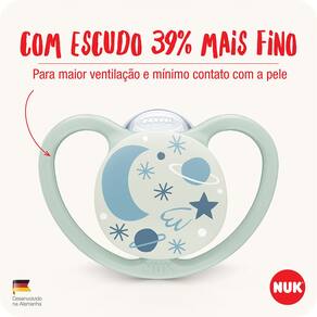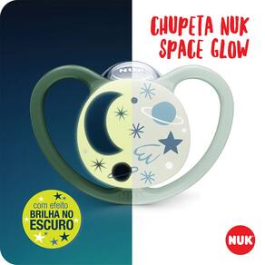 CHUPETA NUK SPACE GLOW TAMANHO 3 +18 MESES NEUTRA Ref: PA7336-2N. Indicado para crianças 18+ meses. Brilha no escuro. Mínimo contato com a pele. O MINISTÉRIO DA SAÚDE ADVERTE: A CRIANÇA QUE MAMA NO PE