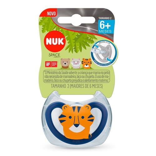 Chupeta Nuk Space Silicone Boy S2 de 6 a 18 Meses é na Drogaria Araujo! Recomendada por especialistas. Liberdade de movimento da língua e encaixe perfeito no rosto. Bicos ortodônticos. Confira!