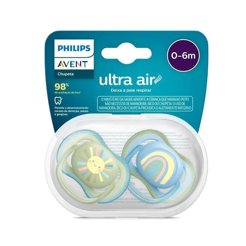 O que é e para o que serve a Chupeta Philips Avent Ultra Air 0 a 6 Meses? A Philips Avent Ultra Air é uma chupeta leve com entradas de ar que permitem que a pele do bebê respire enquanto ele a utiliza.