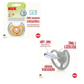 Chupeta Space da Nuk, possui nova tecnologia desenvolvida para o conforto do seu bebê ao longo do seu crescimento. Bico oral fit 2.0, mais fino e mais suave, possui máxima ventilação, mínimo contato com a pele, evitando irritação e alergia no bebê. Sua embalagem pode ser higienizada com vapor no microondas. BPA Free.