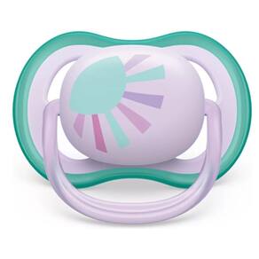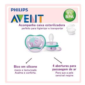 Uma chupeta leve e com aberturas de ar para a pele sensível do bebê. Grandes aberturas para permitir que a pele do bebê respire. Deixe a pele do seu bebê respirar com a Chupeta Philips Avent Ultra Air, que possui 4 grandes aberturas e um escudo leve desenhado para o o máximo de fluxo de ar, para que a pele do bebê continue seca enquanto usa a chupeta.