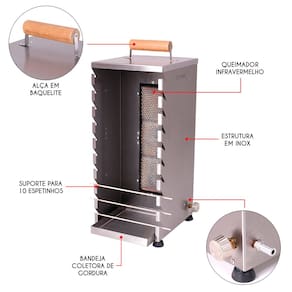 PRINCIPAIS FUNCIONALIDADES: - Assa carnes, peixes e legumes com praticidade; - Capacidade para até 10 espetinhos; - Não produz fumaça; - Estrutura externa e interna em inox de alta durabilidade.