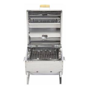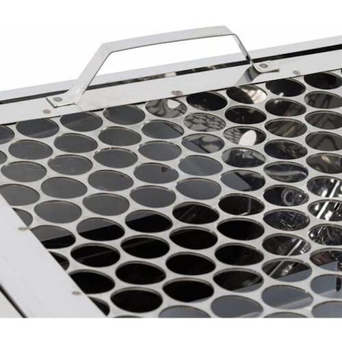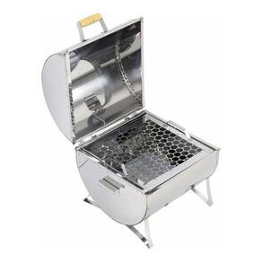 Características da Churrasqueira a Bafo Bafinho Inox a Carvão Ouro de Minas - Churrasqueira do tipo grelha e alimentação a base de carvão, fabricada em aço inox na cor cinza;