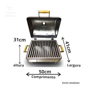 Comprimento 50 cm x 41cm larguraGrelha: comprimento 38 cm / largura 30 cm  Possui Grelha dupla face um lado lisa e outro Parrilha.