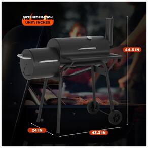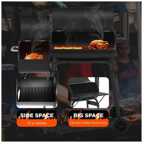 Churrasqueira a carvão portátil com rodas, projetada com dois fornos e três modos de churrasco (assado refogado americano, assado no espeto chinês, assado frito). Possui redes duplas para grelhar, permitindo adicionar carvão durante o uso. Inclui polia inferior para facilitar o transporte e monitor de temperatura para controle preciso do cozimento.Tipo