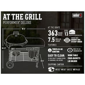 Eletrônico com sistema de ignição alimentado por gás propano tanque de propano não incluído. Dimensões tampa fechada H x W x D, peso 41 kg. Tigela esmaltada de porcelana de de diâmetro e tampa com uma área de cozimento de quadrados. Sistema de limpeza one touch de aço alumínio com removível, alta capacidade, apanhador de cinzas de alumínio. Temporizador de cozinha LCD removível e termômetro de tampa embutido. Instruções de montagem interativas 3D para este produto estão disponíveis através do aplicativo BILT Marca: Não Informado