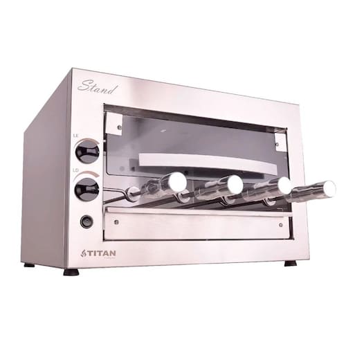 Churrasqueira a gás de bancada 4 espetos com porta de vidro glp 127v stand Versátil e prática, a churrasqueira a gás titan stand oferece assados sem fumaça e com alto desempenho. Conta com 4 espetos rotativos 3 simples e 1 triplo , queimadores infravermelhos, controle individual de chama, acendimento automático e estrutura em inox 304. Possui porta frontal de vidro temperado com abertura telescópica, bandeja coletora de gordura, grade interna e capacidade para até 6,8 kg de carne. Ideal para carnes, peixes, legumes e até pizzas. Atenção: escolha o tipo de gás correto Antes de finalizar a compra, verifique qual o tipo de gás disponível no seu imóvel: - glp gás de botijão ou cilindro : é o famoso gás de cozinha, vendido em botijões ex: p45 . Ideal para casas com abastecimento por botijão ou cilindro. - gn gás natural ou canalizado : conhecido como gás de rua, é fornecido por encanamento, comum em apartamentos e comércios. - escolher a versão errada pode causar falha na instalação e perda da . Desempenho e especificações: - queimadores infravermelhos: 2 unidades; - consumo de gás por queimador: 190 g/h; - consumo total de gás: 380 g/h; - tipo de gás: glp; - pressão de funcionamento: glp 2,8 a 3,5 kpa; - motorredutor elétrico: tensão 127v, potência 28w; - giro do espeto: 6rpm; - consumo elétrico: 0,06 kw/h; - tensão: 127v; - frequência: 60hz; - espetos suportam 1,7 kg. Design e estrutura: - produto fabricado em inox 304 - porta frontal de vidro temperado com sistema telescópico; - estrutura externa em aço inox aisi 304 escovado; - estrutura interna em alumínio; - bandeja coletora de gordura em alumínio com frente de inox; - 04 espetos rotativos com cabo térmico - sendo 03 simples e 01 triplo; - controlador de queimador individual. Medidas: - dimensões do produto axlxp : 40 x 58 x 54 cm; - dimensões da embalagem axlxp : 53 x 68 x 68 cm; - peso líquido: 22,3 kg peso bruto: 26 kg. Acessórios inclusos: - bandeja coletora de gordura com frente de inox; - grade interna de apoio; - 4 espetos rotativos 3 simples e 1 triplo . Informações adicionais: As entregas são feitas em horário comercial e a montagem fica por conta do comprador. As imagens são meramente ilustrativas podendo apresentar itens que não compõe o produto. As cores do produto podem variar de acordo com o monitor ou percepção visual. Marca: Não Informado Ean: 7891960300230