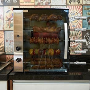 Churrasqueira a gás de bancada vertical 5 espetos stand titan Voltagem: 220v Tipo de gás: glp Prática, compacta e eficiente, a churrasqueira a gás de bancada vertical titan stand é ideal para quem busca churrascos saborosos sem fumaça. Possui 5 espetos rotativos 4 simples e 1 triplo , queimador infravermelho com controle individual, acendimento manual e porta frontal de vidro temperado com abertura prática. Conta ainda com estrutura resistente em aço carbono com pintura epóxi, bandeja coletora de gordura e painel curvo em inox. Perfeita para carnes, peixes e legumes, com capacidade total para até 8,5 kg. Atenção: escolha o tipo de gás correto Antes de finalizar a compra, verifique qual o tipo de gás disponível no seu imóvel: - glp gás de botijão ou cilindro : é o famoso gás de cozinha, vendido em botijões ex: p45 . Ideal para casas com abastecimento por botijão ou cilindro. - gn gás natural ou canalizado : conhecido como gás de rua, é fornecido por encanamento, comum em apartamentos e comércios. - escolher a versão errada pode causar falha na instalação e perda da . Desempenho e especificações: - queimadore infravermelhos: 2 unidades; - consumo de gás por queimador: 190 g/h; - consumo total de gás: 380 g/h; - tipo de gás: glp ou gás natural; - pressão de funcionamento: gás: glp 2,8 a 3,5 kpa gás natural 2,2 kpa; escolher no momento da compra ; - motorredutor elétrico: 12v, potência 28w; - giro do espeto: 6rpm; - consumo elétrico: 0,06 kw/h; - tensão: 127v ou 220v escolher no momento da compra ; - frequência: 60hz; - espetos suportam 1,7 kg. Design e estrutura: - estrutura externa em aço carbono com pintura epóxi em preto fosco; - painel frontal curvo em inox; - coifa interna esmaltada; - bandeja coletora de gordura em alumínio com frente de inox; - porta frontal de vidro temperado; - 05 espetos rotativos com cabo de madeira preto - sendo 04 simples e 01 triplo; - controlador de queimador individual. Medidas: - dimensões do produto axlxp : 64 x 55 x 31 cm; - dimensões da embalagem axlxp : 73 x 62 x 41 cm; - peso líquido: 20,5 kg peso bruto: 23 kg. Acessórios inclusos: - bandeja coletora de gordura com frente de inox; - 5 espetos rotativos 4 simples e 1 triplo . Informações adicionais: As entregas são feitas em horário comercial e a montagem fica por conta do comprador. As imagens são meramente ilustrativas podendo apresentar itens que não compõe o produto. As cores do produto podem variar de acordo com o monitor ou percepção visual. Marca: Não Informado