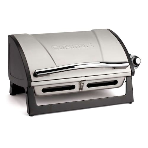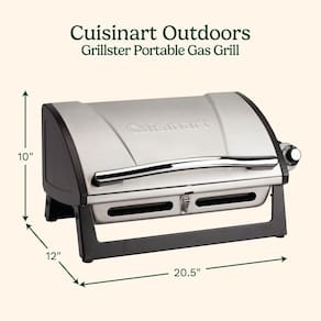 Cuisinart Churrasqueira a gás portátil Grillster, aço inoxidável, compacta, com tampa de bloqueio para facilitar o transporte, churrasqueira a propano pequena de 8000 BTU com grelha de cozinha segura - Superfície de cozimento espaçosa: a grelha de aço esmaltado de 146 polegadas quadradas oferece muito espaço para grelhar e pode ser lavada na lava-louças para facilitar a limpeza. - Desempenho potente: o queimador de 8.000 BTU aquece rápida e uniformemente, atingindo temperaturas acima de 315.6 °C para resultados excepcionais de grelha. - Design portátil: pesa apenas 4,5 kg. com uma estrutura compacta de 48 cm x 29 x 25 cm, é perfeita para camping, uso não autorizado, pátios e varandas. - Tampa de bloqueio para facilitar o transporte: trava segura para transporte e armazenamento sem complicações, tornando-a ideal para viagens. - Configuração rápida: sem necessidade de montagem — pronto para grelhar em menos de 5 minutos sem necessidade de ferramentas ou fósforos.