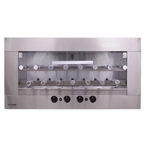 Este modelo é equipado com quatro queimadores infravermelho, um painel frontal modular em aço inox AISI 304 escovado, e uma bandeja coletora de gordura com frente de inox. O controlador de queimador individual e a porta frontal de vidro temperado com sistema telescópico oferecem praticidade e segurança. Com quinze espetos rotativos (treze simples e dois triplos) com cabos térmicos, uma lâmpada interna e um acendedor automático de fogo, cada espeto suporta até 1,7 kg de carne.