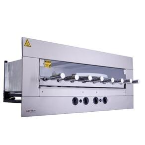 Este modelo apresenta quatro queimadores infravermelho e um painel frontal modular em aço inox AISI 304 escovado, além de uma bandeja coletora de gordura com frente de inox. O controlador de queimador individual e a porta frontal de vidro temperado com sistema telescópico oferecem praticidade e segurança. Possui também oito espetos rotativos (seis simples e dois triplos) com cabos térmicos, uma lâmpada interna, e um acendedor automático de fogo. Cada espeto suporta até 1,7 kg de carne.