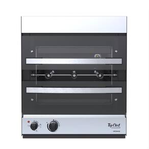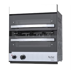 A churrasqueira a gás de embutir Top Chef possui 3 espetos giratórios com capacidade de 2 kg de carne cada, queimador infravermelho, acendimento super automático, luz interna, bandeja coletora de resíduos esmaltada Easy Clean, porta de vidro bi partida com puxadores em alumínio, corpo interno esmaltado Easy Clean e acabamento externo em aço inox escovado.