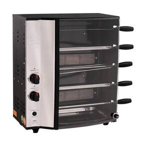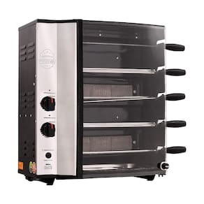 Conta também com capacidade para 5 espetos giratórios, sendo eles 4 simples e 1 triplo, cada espeto suporta 1,5 kg de carne e assa 7,5 kg de carne por hora.
