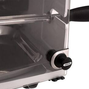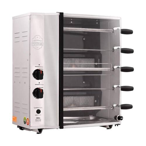Conta também com capacidade para 5 espetos giratórios, sendo eles 4 simples e 1 triplo, cada espeto suporta 1,5 kg de carne e assa 7,5 kg de carne por hora.