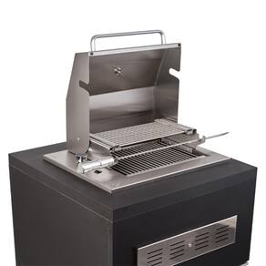 Fabricada em aço inoxidável 304, a churrasqueira oferece durabilidade e resistência. O acendimento automático, aliado ao registro de controle de temperatura com botões em alumínio, proporciona uma experiência de uso prática e segura. A tampa é equipada com um termômetro integrado, puxador curvo para maior segurança e uma grelha adicional para descanso dos alimentos, enquanto a bandeja para água ajuda a manter a umidade durante o cozimento.