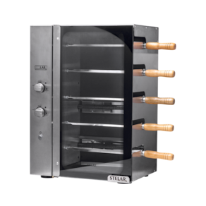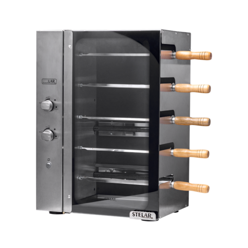 Funções: assa diferentes tipos de carne Tensão/voltagem (v): 127 ou 220 (escolha no momento da compra) Com 5 espetos rotativos em inox Bandeja coletora de resíduos.