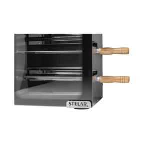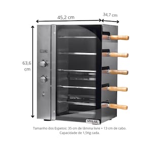 Dimensões internas: Largura: 34 cm x Altura 58 cm x Profundidade 26 cm. Tamanho dos Espetos: 35 cm de lâmina + 13 cm de cabo e Capacidade de 1,5Kg cada.