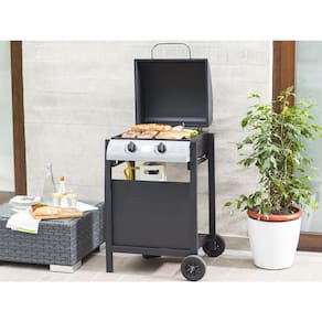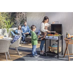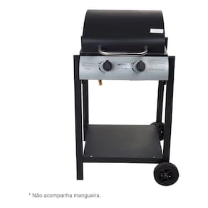 Churrasqueira a gás com 2 queimadores, potência de 6,3 kW (21.500 BTU), área de cocção de 40x44 cm, ignição piezoelétrica, rodas para transporte, tampa inclusa.Vendido por Home Living e entregue por Casas Bahia