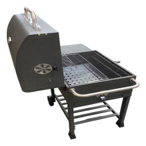 Feito com chapas de aço e com termometro de luxo. Area para cozimento: 58 x 42 cm l x p . Tampa articulada para cozinhar ou defumar Grelha com acabamento esmaltado para facilitar a limpeza Prateleira lateral dobrável com gancho e armazenamento Bandeja de carvão de altura ajustável para controle de temperatura Porta de acesso para carvão e coletor de cinza removível Grelha de aquecimento separada. A grade se encaixa perfeitamente em todos os jardins. Graças à construção sólida, é muito estável e garante a segurança de uso. Seu tamanho permite que você prepare muitas deliciosas iguarias ao mesmo tempo.