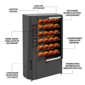 Achou pouco? Esta frangueira tem regulagem para a velocidade de giro dos espetos, para garantir que seja assado de maneira uniforme.