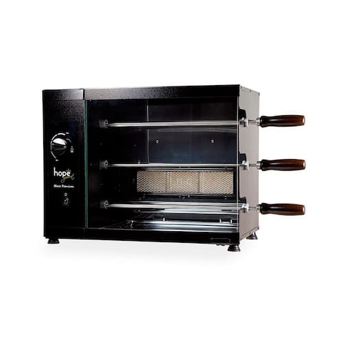 A Churrasqueira de Bancada Blaze Premium 03 a Gás GLP é a opção ideal para quem quer curtir um churrasco sem fumaça em apartamentos ou varanda. Conta com espetos rotativos, queimador infravermelho e vedação eficiente para te dar aquela carne suculenta e macia. Além disso, é bivolt, fácil de limpar e conta com garantia de 6 meses. CARACTERÍSTICAS TÉCNICAS: - Produzido em Aço Carbono na Cor Preto; - Sistema de Rotação de Espetos; - Aquecimento por Gás GLP 2,8 Kpa (280 mmCA); - Contém 1 Queimador Infravermelho; - Motor: 1/30 cv; - Tensão: 127v (bivilt) | 220v (bivolt); - Consumo de Energia: 0,090 KWh | 0,070 KWh; - Potência total Resiências: 90 W | 70 W; - Consumo de gás: 190 g/h por queimador; - Vidro Temperado Reticulado; - Capacidade de 1,5Kg de Carne por Espeto; - Garantia de 6 Meses. DIMENSÕES DA CHURRASQUEIRA: Altura: 43 Cm Largura: 56 Cm Profundidade: 37 Cm Peso: 15 kg ITENS INCLUSOS: - 1 Churrasqueira Blaze Premium 03; - 1 Bandeja Coletora de Gorduras; - 3 Espetos Simples; - 1 Kit Gás GLP. INFORMAÇÕES ADICIONAIS: *As imagens ambientadas são meramente ilustrativas podendo apresentar itens que não compõe o produto. As cores do produto podem variar de acordo com o monitor ou percepção visual. **Limpeza e/ou manutenção devem utilizar escova com cerdas macias e pano úmido, não utilizar produtos abrasivos. CASATONA REPRESENTANTE AUTORIZADO HOPE GOURMET ® Marca: Hope Gourmet