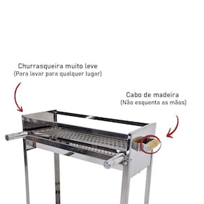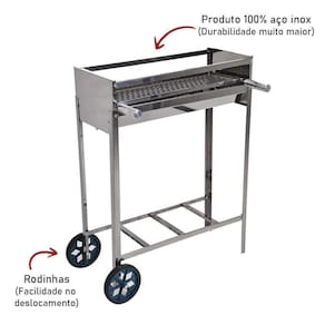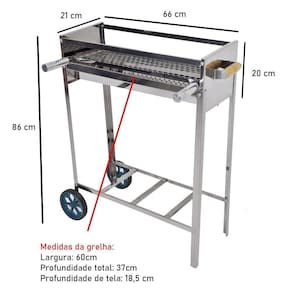Churrasqueira Carrinho Espetinhos Portátil com Grelha Inox Juntar a família e amigos numa verdadeira churrascada é um hábito entre brasileiros e por isso a Issi Grill desenvolveu uma linha completa para churrasco desde churrasqueiras, espetos, acessórios para atender aos mais exigentes churrasqueiros de plantão. Um bom churrasco é a melhor pedida para uma confraternização, não é mesmo Foi pensando nisso que a Issi Grill desenvolveu a Churrasqueira Portátil para Espetinhos com Rodas e Grelha Moeda. Agora seu churrasco fica mais completo e sem dúvida mais saborosa, ao nível das melhores churrascarias do Brasil.Suas carnes ficarão mais suculentas e com um visual diferenciado Agora na Issi Grill você encontra esse e muitos outros produtos para churrasco CARACTERÍSTICAS DO PRODUTO:Estrutura inox 430Super prática ACOMPANHA:01 Churrasqueira Portátil com Rodas01 Grelha Moeda DETALHE IMPORTANTE:Churrasqueira móvel podendo ser transportada através das rodas. DIMENSÕES:Largura: 66cmProfundidade: 21cmAltura Total: 86cmPeso Bruto: 4 Kg Grelha:Largura: 60cmProfundidade Total: 37cmProfundidade de Tela: 18,5cm Aviso Importante: Evite Acidente com Fogo, Proteja sua família ITEM INCLUSO:01 Churrasqueira com Rodas01 Grelha Dúvidas Frequentes:Qual material do produtoR: Feito em aço inox 430 de excelente qualidade e durabilidade. Marca: Issi Grill