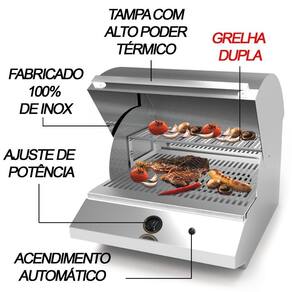 Com a churrasqueira a gás de bancada é possível assar carnes sem carvão, já que seu acendimento é automático e seu funcionamento é através de GN. Com estrutura em aço inox 304 de alto brilho, proporcionando máxima qualidade e resistência a churrasqueira. Possui acendedor automático, bandeja coletora de gordura, revestimento térmico e um queimador infravermelho de mega potência, permitindo um ótimo desempenho. Para maior segurança dos usuários, conta também com fio anti-chamas, e é certificada pelo Inmetro. Ao comprar esta churrasqueira você terá à disposição um equipamento de máximo desempenho e eficiência para preparar uma deliciosa carne assada.