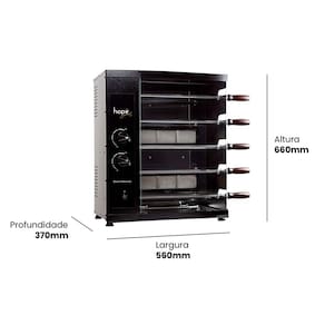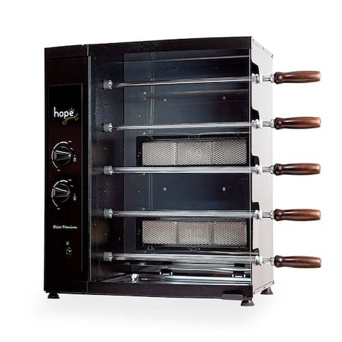 A Churrasqueira de Bancada Blaze Premium 05 a Gás Natural é a opção ideal para quem quer curtir um churrasco sem fumaça em apartamentos ou varanda. Conta com espetos rotativos, queimador infravermelho e vedação eficiente para te dar aquela carne suculenta e macia. Além disso, é bivolt, fácil de limpar e conta com garantia de 6 meses. CARACTERÍSTICAS TÉCNICAS: - Produzido em Aço Carbono na Cor Preto; - Sistema de Rotação de Espetos; - Aquecimento por Gás Gás Natural 2,2 Kpa (220 mmCA); - Contém 2 Queimadores Infravermelho; - Motor: 1/30 cv; - Tensão: 127v (bivilt) | 220v (bivolt); - Consumo de Energia: 0,090 KWh | 0,070 KWh; - Potência total Resiências: 90 W | 70 W; - Consumo de gás: 190 g/h por queimador; - Vidro Temperado Reticulado; - Capacidade de 1,5Kg de Carne por Espeto; - Garantia de 6 Meses. DIMENSÕES DA CHURRASQUEIRA: Altura: 66 Cm Largura: 56 Cm Profundidade: 37 Cm Peso: 21 kg ITENS INCLUSOS: - 1 Churrasqueira Blaze Premium 05; - 1 Bandeja Coletora de Gorduras; - 5 Espetos Simples; - 1 Kit Gás Natural. INFORMAÇÕES ADICIONAIS: *As imagens ambientadas são meramente ilustrativas podendo apresentar itens que não compõe o produto. As cores do produto podem variar de acordo com o monitor ou percepção visual. **Limpeza e/ou manutenção devem utilizar escova com cerdas macias e pano úmido, não utilizar produtos abrasivos. CASATONA REPRESENTANTE AUTORIZADO HOPE GOURMET ® Marca: Hope Gourmet