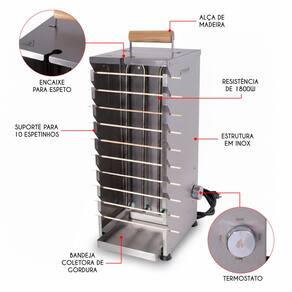 Churrasqueira elétrica portátil com estrutura externa e interna em Inox, alça em madeira resistente ao calor, resistência de 1800W, termostato Mín/Méd/Máx, luz piloto, pés antiderrapante e bandeja coletora de gordura em Inox. Capacidade para 10 espetinhos ou 1 espeto na vertical.Vendido por Dolar Churrasqueiras e entregue por Casas Bahia