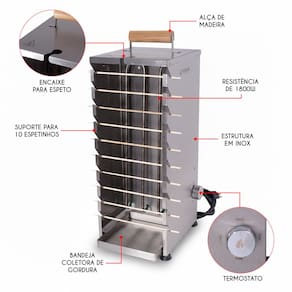 - Capacidade de 10 Espetinhos ou 1 Espeto na Vertical