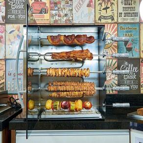 Churrasqueira elétrica de bancada vertical com 5 espetos rotativos (4 simples e 1 triplo), painel curvo em inox, porta de vidro temperado e bandeja coletora de gordura. Potência total de 2100W (resistências) e motorredutor de 28W. Possui luz piloto e seletor de temperatura com níveis indicativos. Estrutura externa em aço carbono com pintura epóxi em preto fosco. Espetos com cabos de madeira preta. Capacidade de até 8,5 kg de carne (1,7kg por espeto).Infelizmente não temos estoque do produto que você está procurando no momento.