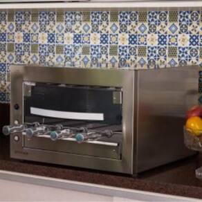 A churrasqueira possui uma estrutura externa em aço inox AISI 304 escovado, que combina durabilidade e estética, e uma estrutura interna em alumínio para otimizar o desempenho. Com bandeja coletora de gordura em alumínio e frente em inox, facilita a limpeza. A grade interna de apoio e a porta frontal de vidro temperado com sistema telescópico aumentam a praticidade durante o uso. Os quatro espetos rotativos, sendo três simples e um triplo, possuem cabos térmicos, garantindo segurança ao manusear.