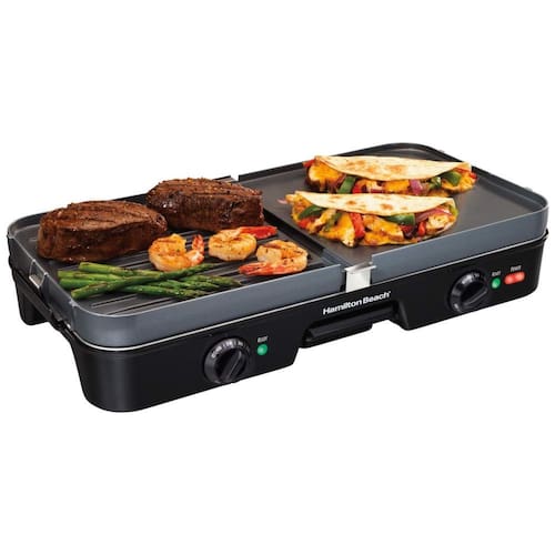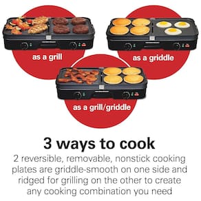 Churrasqueira elétrica com grelha para 8 porções, placas antiaderentes reversíveis, zonas de cozimento duplas e bandeja coletora removível.