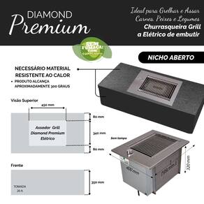 DESIGN E ESTRUTURA: - Produto fabricado em ac¸o INOX 304; - Luz piloto: Indica quando o GRILL está ligado; - Painel com indicadores: Desligado, mínimo, médio e máximo; - Grelha em INOX de 6,35mm removível; - Grelha removível. - Frequência: 60Hz; - Consumo elétrico 3,0 Kw/h; - Sistema exclusivo de tampa com termômetro; - Grelha superior; - Tampa com Termômetro - Veneziana; - 01 espeto simples com cabo térmico.