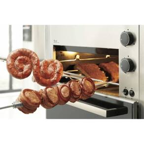 3 Espetos Rotativos: Acompanha 3 espetos (1 triplo e 2 simples) com sistema rotativo, que assam a carne de maneira uniforme, garantindo um resultado suculento e saboroso.