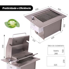 DESIGN E ESTRUTURA: - Acabamento superior, em aço INOX 304; - Registro de controle da temperatura, com botões em ALUMÍNIO; - Termômetro na tampa para identificar a temperatura; - Grelha para descanso em INOX; - Bandeja para água; - 01 Espeto simples com cabo térmico;