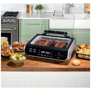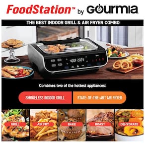 Grill sem fumo com extração elétrica, Air Fryer com sistema avançado de fluxo de ar, 5 funções de cozimento (Grill, Air Fry, Assar, Assar, Desidratar), tecnologia de extração de fumaça embutida, inclui grelha e cesta para air fry, tampa de vidro, peças removíveis e antiaderentes para fácil limpeza.Vendido e entregue por Ecletiq