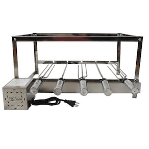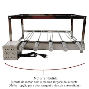 Churrasqueira Gira Grill Inox 5 Espetos Giratório Churrasco - Issi Grill Juntar a família e amigos numa verdadeira churrascada é um hábito entre brasileiros e por isso a Issi Grill desenvolveu uma linha completa para churrasco desde churrasqueiras, espetos, acessórios para atender aos mais exigentes churrasqueiros de plantão. Excelente para fazer aquele churrasco no almoço, jantar e até levar para praia, pescaria entre outros. Agora seu churrasco fica mais completo e sem dúvida mais saborosa, ao nível das melhores churrascarias do Brasil. A linha de Grill Giratório Motor Fixo Issi Grill apresenta sua estrutura em chapa de aço inox 430 escovado com opção de 4,5,e 6 Espetos com kit elétrico rotativo Bivolt, ideal para churrasqueiras revestidas Agora seu churrasco fica mais completo e sem dúvida mais saborosa, ao nível das melhores churrascarias do Brasil. Tudo fica mais gostoso no espeto giratório, pois a carne fica mais suculenta e macia, com o giro constante do espeto ela não perde sua gordura e sumos, elevando a qualidade do assado.Suas carnes ficarão mais suculentas e com um visual diferenciado Agora na Issi Grill você encontra esse e muitos outros produtos para churrasco CARACTERÍSTICAS DO PRODUTO:Estrutura inox escovado 430Super práticaDisponível nas versões com 4, 5, e 6 EspetosMotor Elétrico Bivolt O motor fica alinhado à largura do suporte, não fica pra fora dando uma estética ainda mais sofisticadaModelo WEG 1/30 Hps O melhor da categoriaMotor fixo ACOMPANHA:03 Espetos Tridente em Inox com cabos revestidos em ALUMÍNIO, não superaquecem02 Espetos Espada em Inox com cabos revestidos em ALUMÍNIO, não superaquecem OBSERVAÇÕES IMPORTANTES:- Este produto é BIVOLT, com chave seletora de voltagem, saindo pré-ajustado de fábrica na voltagem 220v, verificar antes de ligar na tomada DETALHE IMPORTANTE:Grill possui Motor fixo. DIMENSÃO:Largura: 60cmProfundidade: 45cmAltura: 30cmLargura do motor: 15cm Aviso Importante: Evite Acidente com Fogo, proteja sua família ITENS INCLUSOS:03 Espetos tridente em inox02 Espeto espada em Inox01 Grill Giratório Dúvidas Frequentes: Qual material do produtoR: Feito em aço inox escovado 430 de excelente qualidade e durabilidade. Qual a potência do MotorR: Motor elétrico bivolt - modelo WEG 1/30 Hps, o melhor da categoria. Marca: Issi Grill