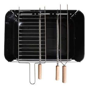 Medidas: 54cm x 35cm x 64cm1 Grelha Simples - 46,7 cm x 16,7 cm x 1,5cm2 Espetos simples - 48cm1 Espeto duplo - 48cmMedidas da bacia: 49,5cm x 34,5cm x 5,5cm