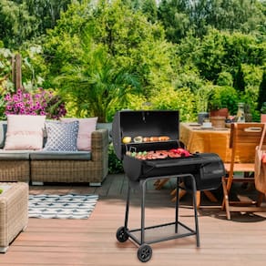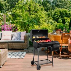 Churrasqueira a Carvão com Defumador 2 em 1. Dimensoes: 115 cm (L) x 68 cm (P) x 106,5 cm (A). Peso bruto: 26,7 kg. Area de coccao: 64x41 cm. Inclui tampa e rodas para facil movimentacao. Material: Aco. Cor: Preto. Procedencia: Importado da China. Garantia: 6 meses.Vendido por Home Living e entregue por Casas Bahia