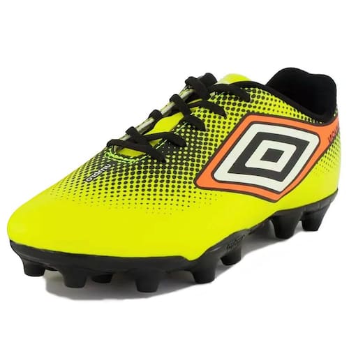 Seu cabedal é construído em material sintético laminado com aplicação de grafismo reticulado e forro em tecido de poliéster. Possui Diamante Umbro na lateral estilizado com a assinatura do modelo, atacador convencional e palmilha interna em EVA forrado. O solado de campo FG de 14 travas é construído em PVC.