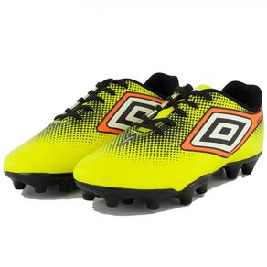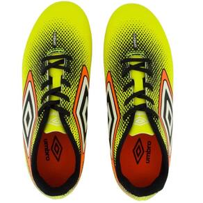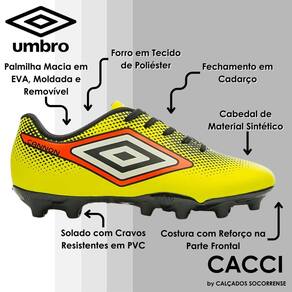Seu cabedal é construído em material sintético laminado com aplicação de grafismo reticulado e forro em tecido de poliéster. Possui Diamante Umbro na lateral estilizado com a assinatura do modelo, atacador convencional e palmilha interna em EVA forrado. O solado de campo FG de 14 travas é construído em PVC.