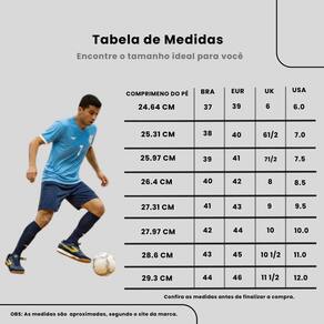 Caracteristicas: - Tipo: Futsal - Material: Sintético - Trava: Sem Trava - Cabedal: Cabedal em sintético para resistência e flexibilidade. - Solado: Borracha antiderrapante para quadras indoor e outdoor - Peso do Produto: 239 g (O peso do produto varia de acordo com a numeração)