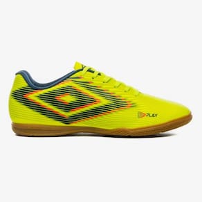 A Chuteira Futsal Umbro Play apresenta um design com efeito 3D e arte do diamante recortado. O cabedal (parte superior do calçado) é construído em material sintético laminado e texturizado, com aplicação de grafismos em linhas onduladas que sobrepõem o Diamante Umbro estilizado, proporcionando uma ilusão de profundidade e movimento em toda a lateral da chuteira. Possui palmilha macia em EVA e forro interno em poliéster. Contém solado de futsal em borracha.